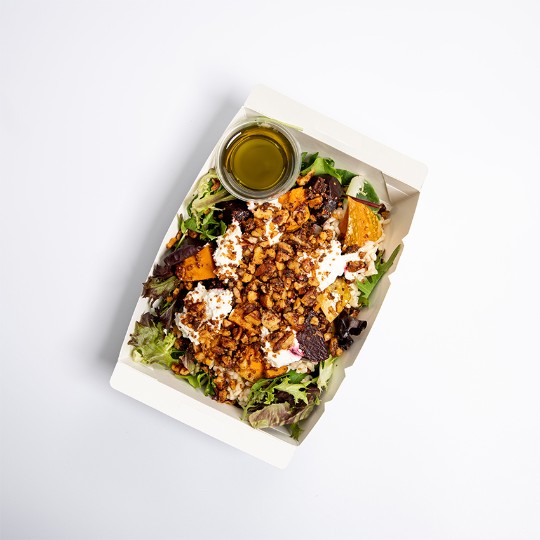 <p>Roast Beetroot, Butter Bean, Roast Capsicum, Brown Rice, Tahini Dressing, Paprika, Roast Almonds, Sunflower Seeds, Mixed Herbs.</p>
